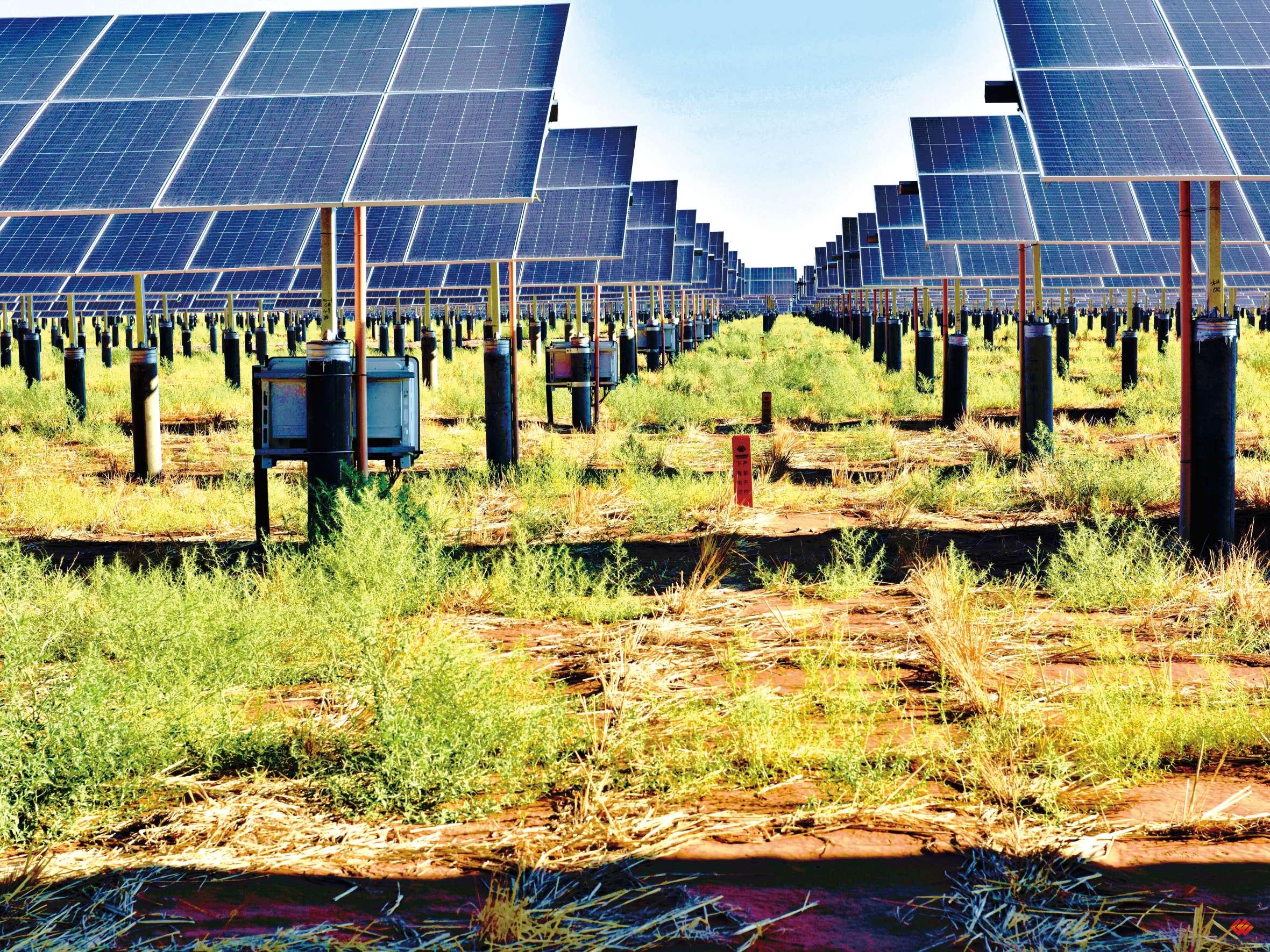宁夏腾格里沙漠新能源基地项目实现����� �������Ƴ����������� �������Ƴ������������ �������Ƴ����������� �������Ƴ�������发绿电、治黄沙两不误,在生态、经����� �������Ƴ������������ �������Ƴ������������ �������Ƴ������������ �������Ƴ�������济和社会方面效益显著。2023 年建成以来,播����� �������Ƴ������������ �������Ƴ����������� �������Ƴ������������ �������Ƴ�������撒沙米、沙蒿等五种适宜沙漠地����� �������Ƴ������������ �������Ƴ����������� �������Ƴ������������ �������Ƴ�������区生长的草籽,通过自然雨水灌溉促使����� �������Ƴ������������ �������Ƴ������������ �������Ƴ������������ �������Ƴ�������草籽发芽,植被覆盖率由之前的0 提升至1����� �������Ƴ������������ �������Ƴ������������ �������Ƴ������������ �������Ƴ�������0%。周边种植6,000 亩����� �������Ƴ������������ �������Ƴ������������ �������Ƴ������������ �������Ƴ�������柠条、沙柳、沙拐枣等灌木,进一步发挥����� �������Ƴ������������ �������Ƴ������������ �������Ƴ������������ �������Ƴ�������防风固沙的作用。